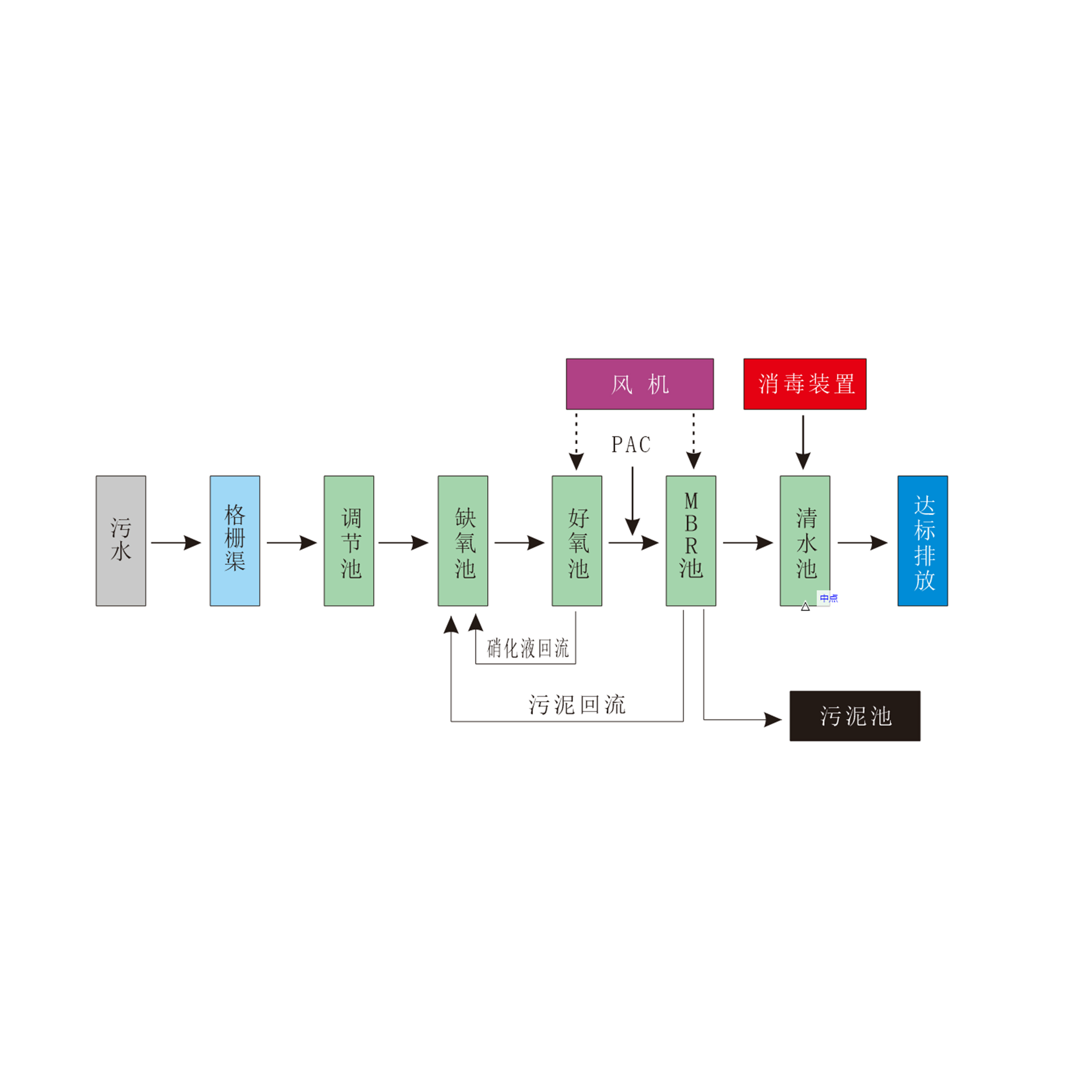• 工艺原理:采用缺氧-好氧(AO)生物处理,并以膜生物反应器(MBR)取代传统二沉池。利用中空纤维膜或平板膜进行固液分离,出水清澈,且可将污泥完全截留在生物池内,保持高活性污泥浓度。