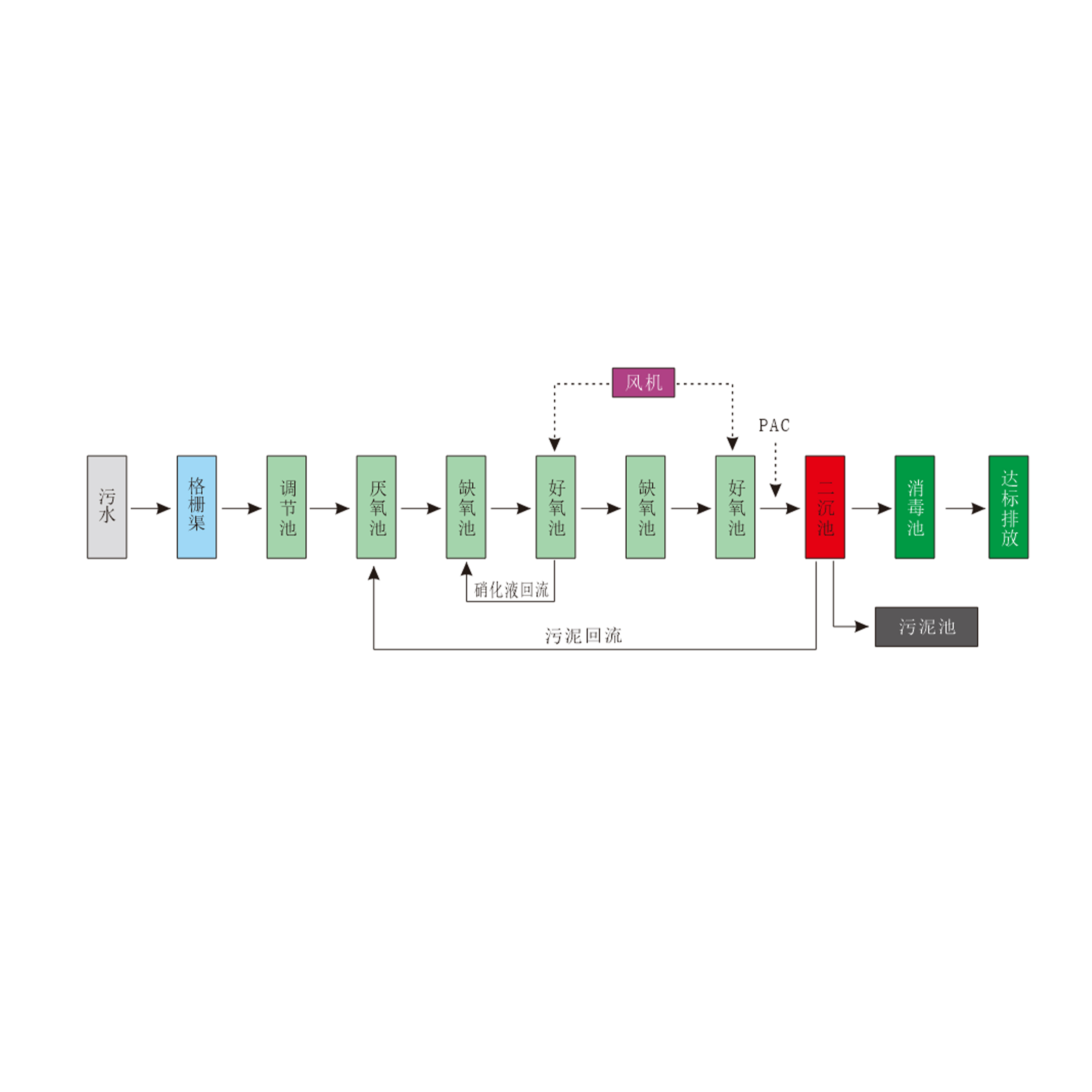• 技术特点:脱氮效率相对较高,流程灵活性好;运行管理相对成熟;对水质变化的适应性较强。